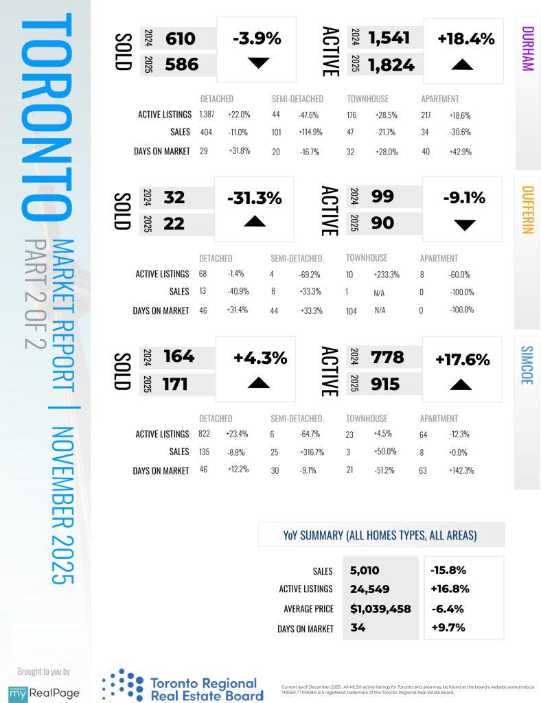 GTA REALTORS® reported 5,010 home sales through TRREB’s MLS® System in November 2025 – down by 15.8 per cent compared to November 2024. New listings entered into the MLS® System amounted to 11,134 – down by four per cent year-over-year.