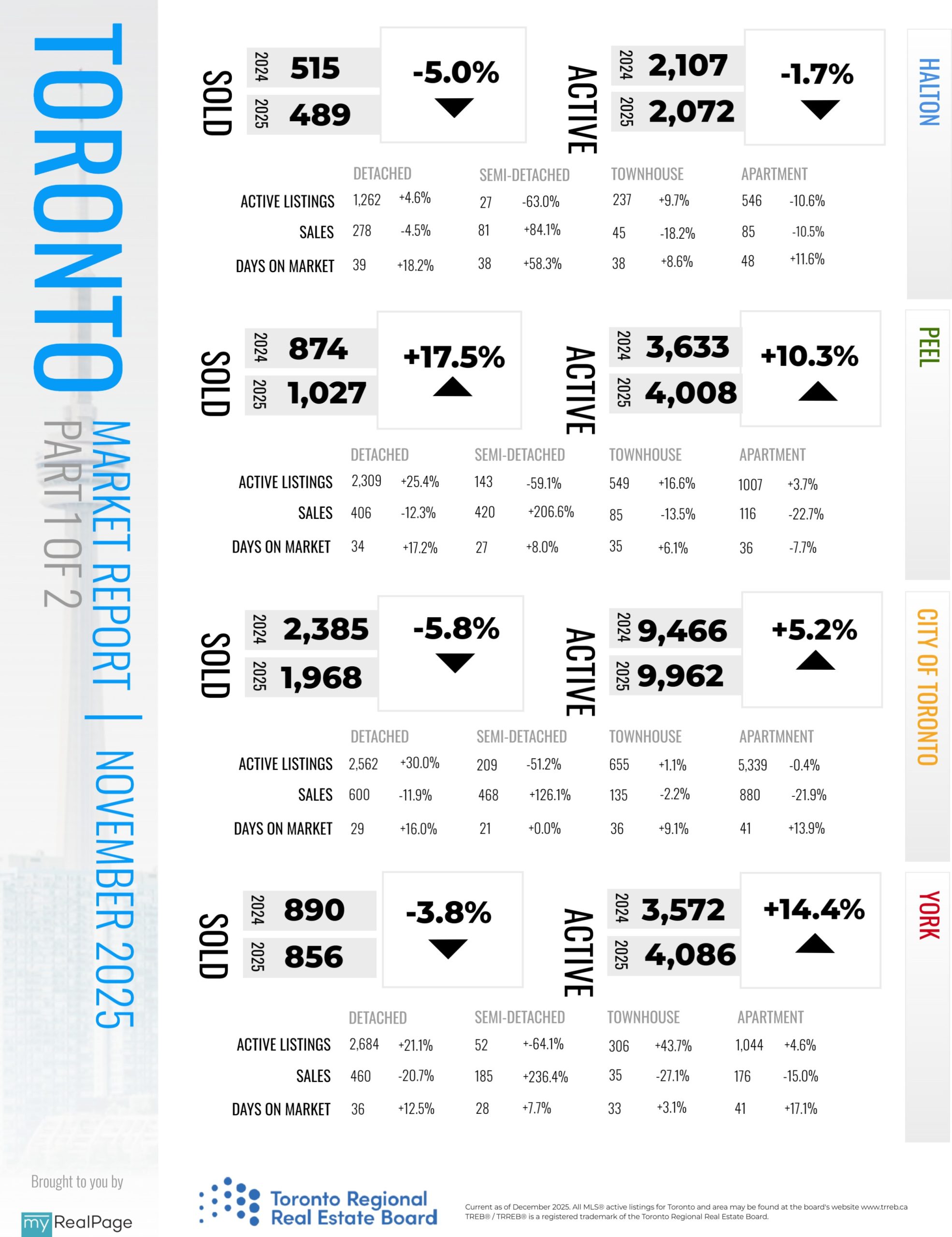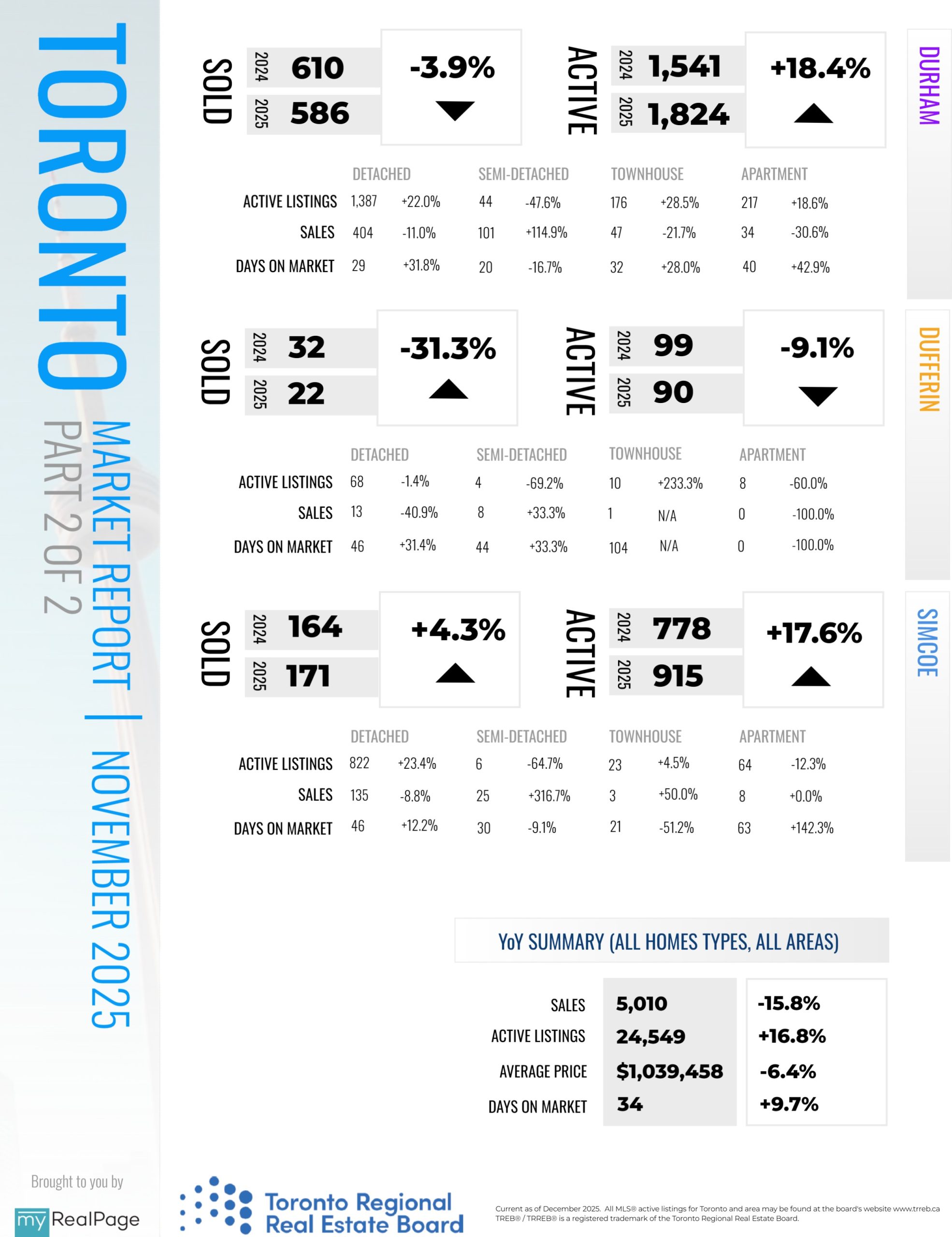 “There are many GTA households who want to take advantage of lower borrowing costs and more favourable selling prices. What they need most is confidence in their long-term employment outlook. Fortunately, we saw encouraging news on jobs and the broader economy in November. If this positive momentum continues, consumer confidence will strengthen, and more people will be in a position to consider purchasing a home in 2026,” said TRREB President Elechia Barry-Sproule.